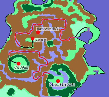 火のクリスタルの輝きがもどったことにより、クレセントレイクの町の左上にいる男や、エルフの町の予言者から、この氷の洞窟についての情報が聞ける。